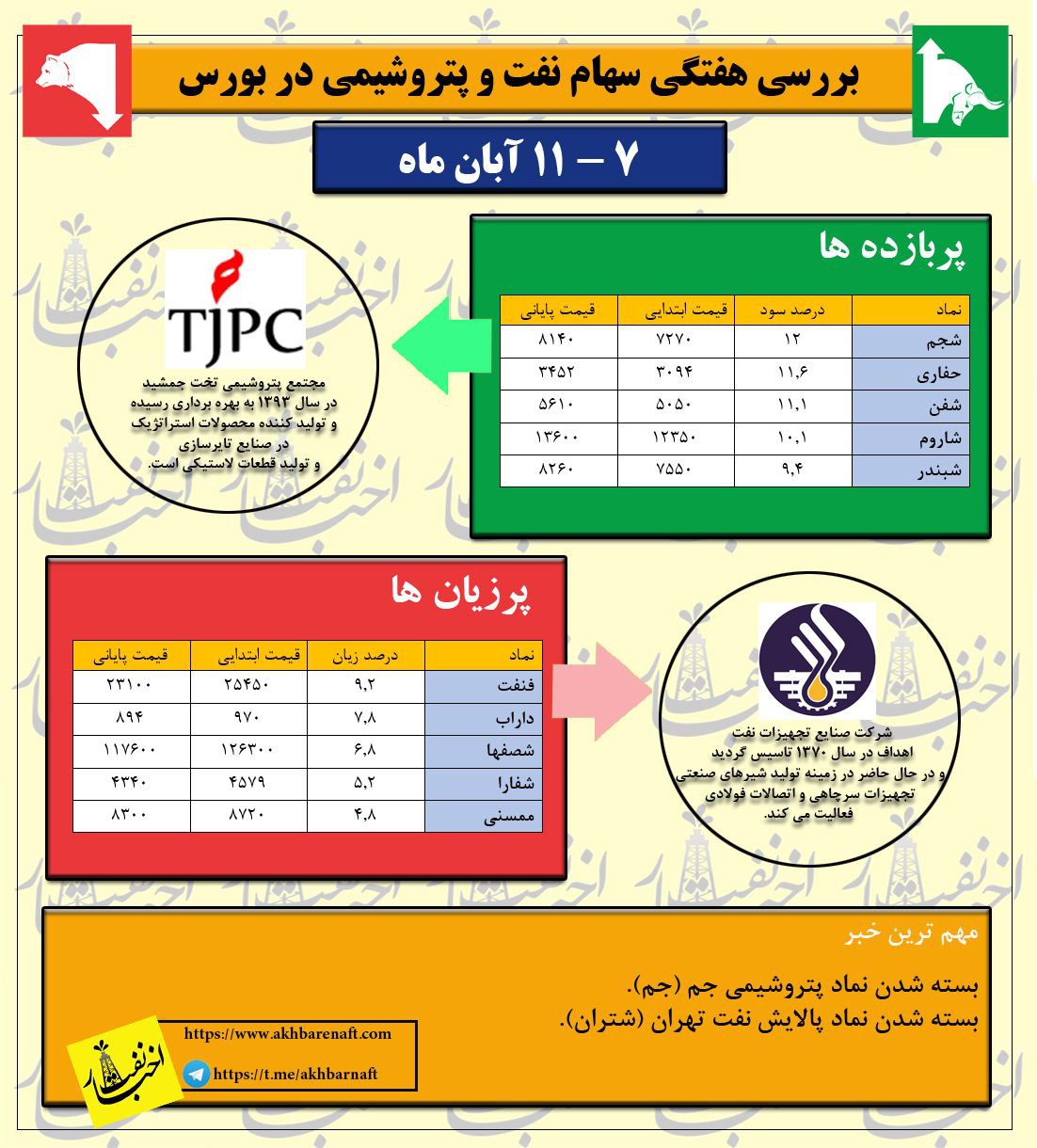 در میان سهام مرتبط با نفت و پتروشیمی، بیشتر سهام ها، با رشد قیمت همراه بودند. در صدر جدول پربازده ها این هفته، صنایع پتروشیمی تخت جمشید (شجم) قرار داشت که با ۱۲ درصد سود هفتگی، رشد بسیار چشمگیری داشت. پتروشیمی فن آوران (شفن) و صنایع حفاری (حفاری) هم با رشد بیش از ۱۱ درصد در این جدول جای داشتند.