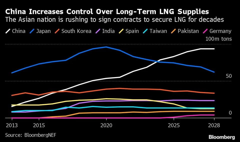 تقریباً یک ششم کل قراردادهای مدتدار که تحویل LNG را تا سال ۲۰۲۷ آغاز میکنند، با شرکتهای چینی منعقد شده و چین به عنوان خریدار اصلی از ژاپن پیشی گرفته است.